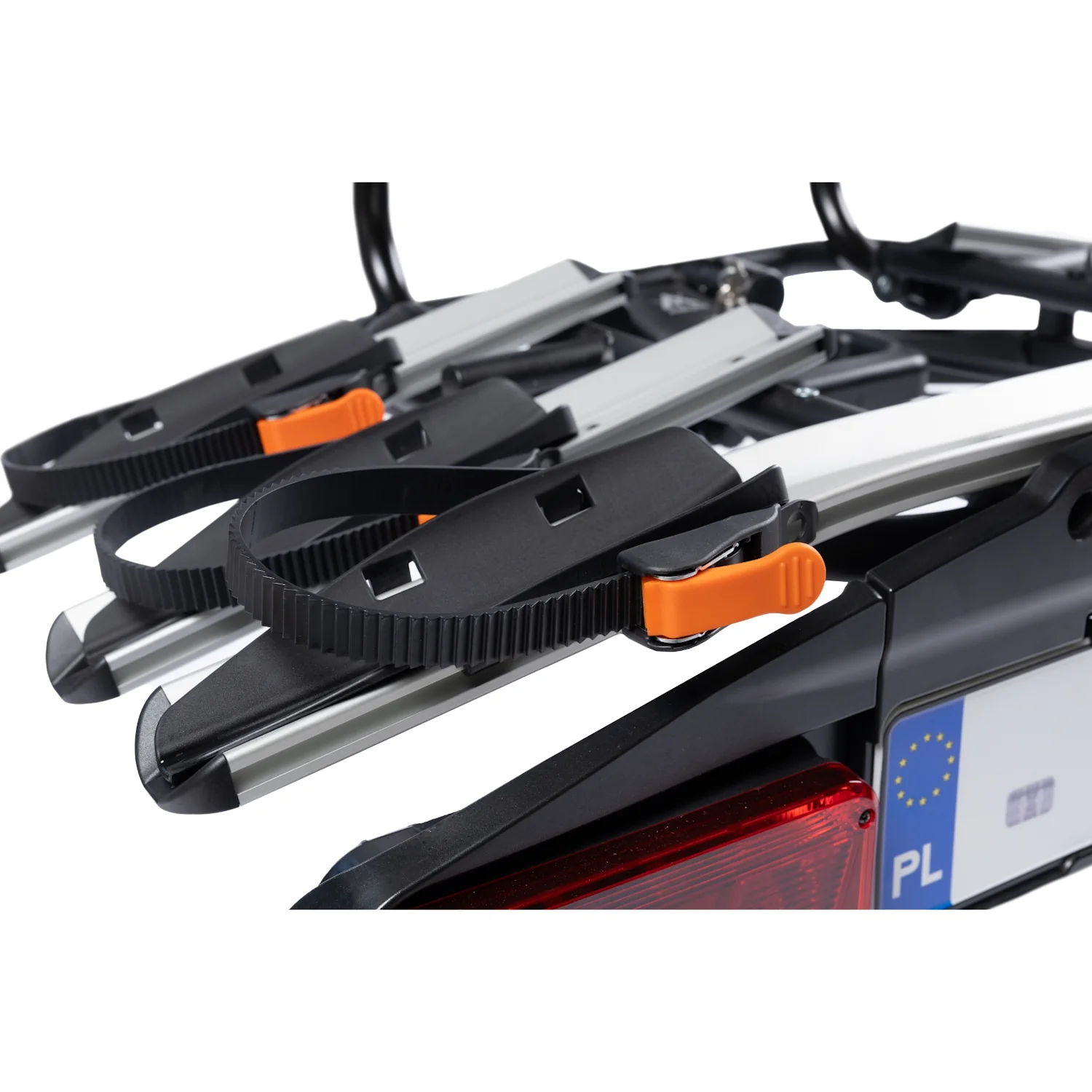 Większy rozstaw oraz szerokie rynienki ułatwiają ustawienie rowerów i poprawiają ich stabilność podczas jazdy. Dzięki temu nawet rowery z grubszymi oponami lub większym rozstawem osi są dobrze podparte i bezpieczne w transporcie. Dodatkowym ułatwieniem jest szybki system montażu oraz intuicyjna regulacja.