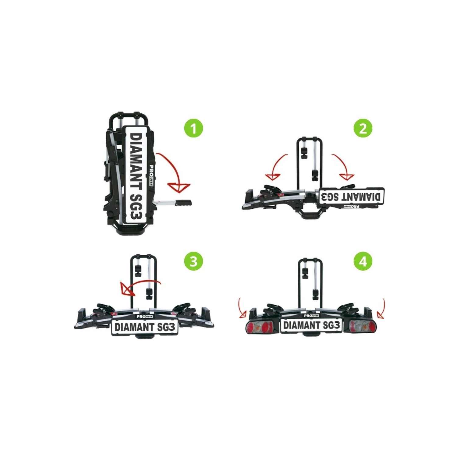 Pro-User Diamant SG3 to funkcjonalny bagażnik rowerowy na hak do przewozu trzech rowerów. bagażnik rowerowy na hak łączy prostotę obsługi z uniwersalnym zastosowaniem.