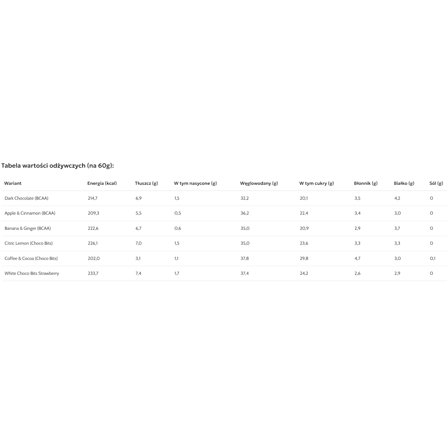 Wariant DARK CHOCOLATE wyróżnia się intensywnym, głębokim smakiem ciemnej czekolady, który doskonale przełamuje naturalną słodycz owoców. To idealna propozycja dla osób szukających mniej słodkiego profilu smakowego. Dodatek aminokwasów BCAA wspiera regenerację mięśni oraz ogranicza katabolizm podczas długotrwałego wysiłku.Każdy baton dostarcza ponad 200 kcal oraz aż 35 g węglowodanów, co czyni go niezawodnym wsparciem energetycznym podczas treningów, zawodów oraz aktywnego dnia. Miękka, zwarta konsystencja umożliwia wygodne spożycie nawet w trakcie intensywnego wysiłku.