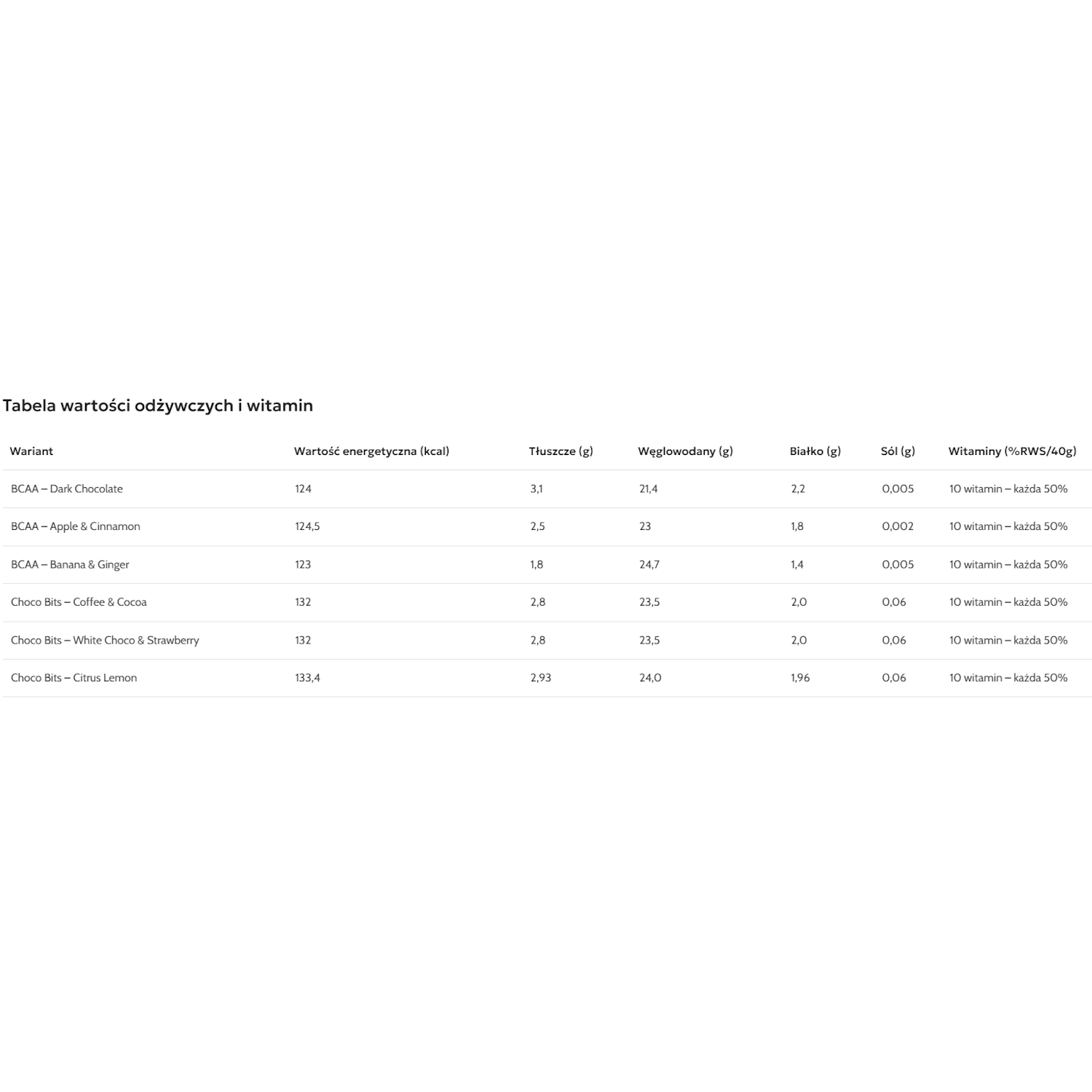 Wariant LEMON wyróżnia się świeżym, cytrusowym smakiem, który przełamuje słodycz i dobrze sprawdza się przy dłuższych aktywnościach. Dodatkowym atutem są chrupiące kawałki czekolady (choco bits), które nadają batonowi ciekawą strukturę i urozmaicają jego konsystencję. Każda porcja dostarcza od 15 do 25 g węglowodanów, pomagając utrzymać poziom energii podczas treningów i zawodów.