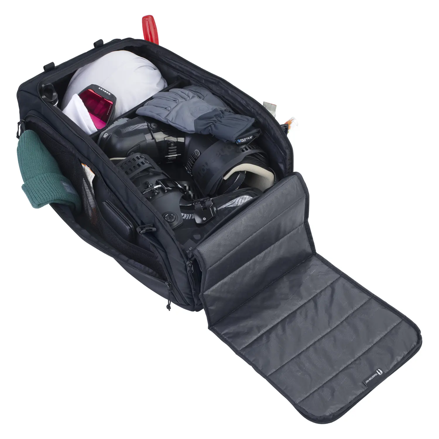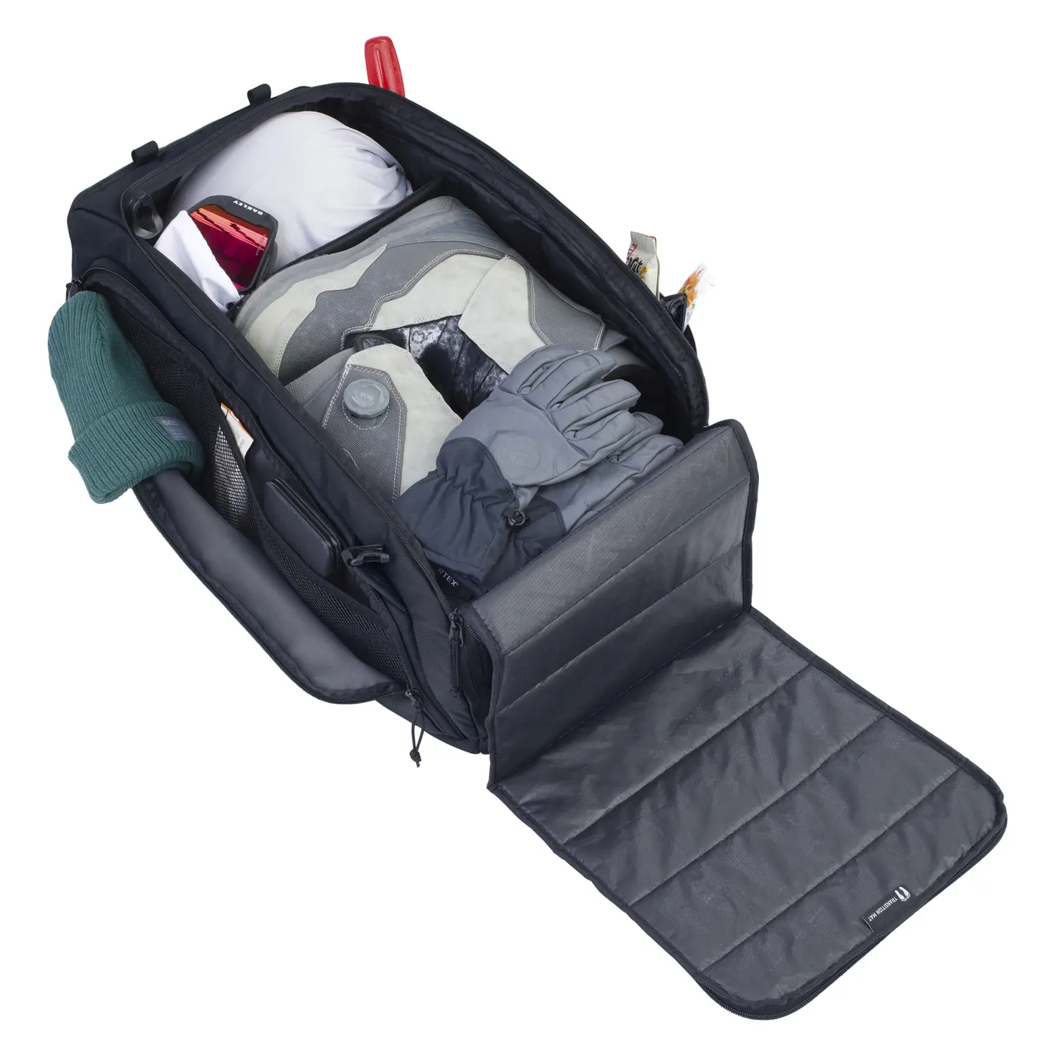 Główna komora z szerokim otwarciem ułatwia dostęp do zawartości, a oddzielna wentylowana przegroda na buty zapobiega mieszaniu się brudnych rzeczy z resztą bagażu. Boczne kieszenie pozwalają szybko sięgnąć po mniejsze przedmioty, a wodoodporna mata do przebierania dodaje wygody w terenie. Torba łączy w sobie solidne wykonanie, praktyczność i minimalistyczny, sportowy wygląd.