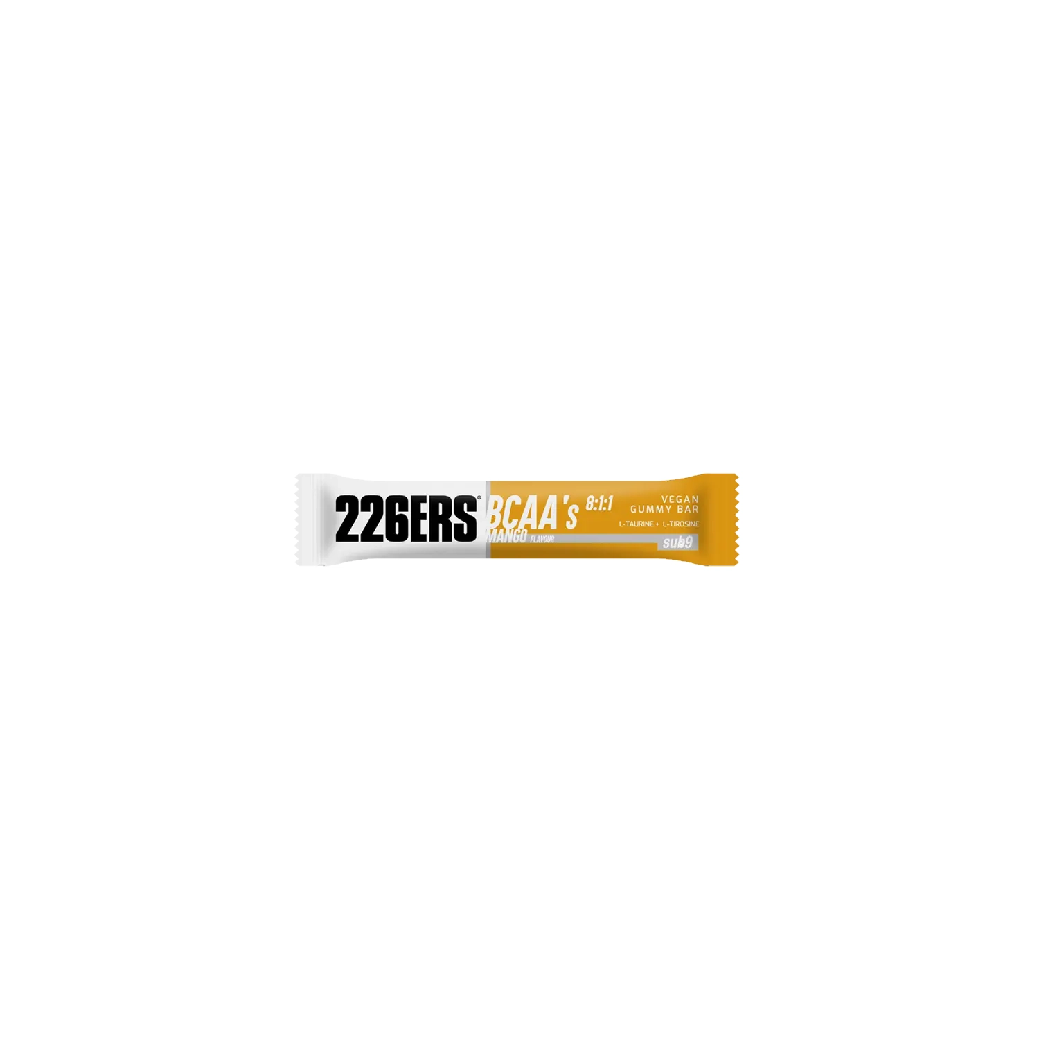 VEGAN GUMMY BAR 226ERS to żelowa przekąska energetyczna oparta na pektynie i składnikach roślinnych, takich jak cukier trzcinowy i syrop ryżowy. Dostarcza 17 g węglowodanów, zapewniając szybkie uzupełnienie energii podczas wysiłku. Wariant BCAA MANGO.
