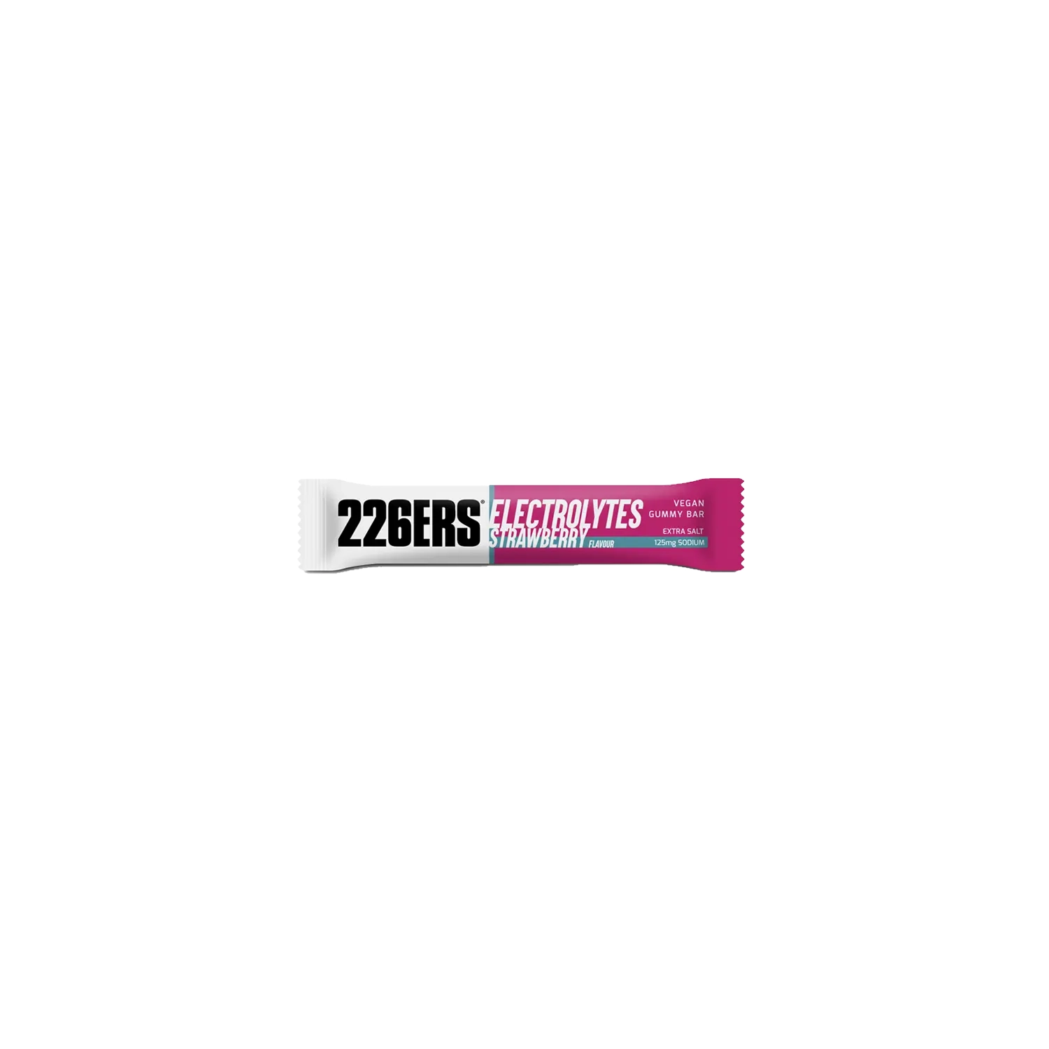 VEGAN GUMMY BAR 226ERS to żelowa przekąska energetyczna z elektrolitami, oparta na pektynie i składnikach roślinnych, takich jak cukier trzcinowy oraz syrop ryżowy. Dostarcza 17 g węglowodanów, wspierając energię i nawodnienie podczas wysiłku. Wariant ELECTROLYTE STRAWBERRY.